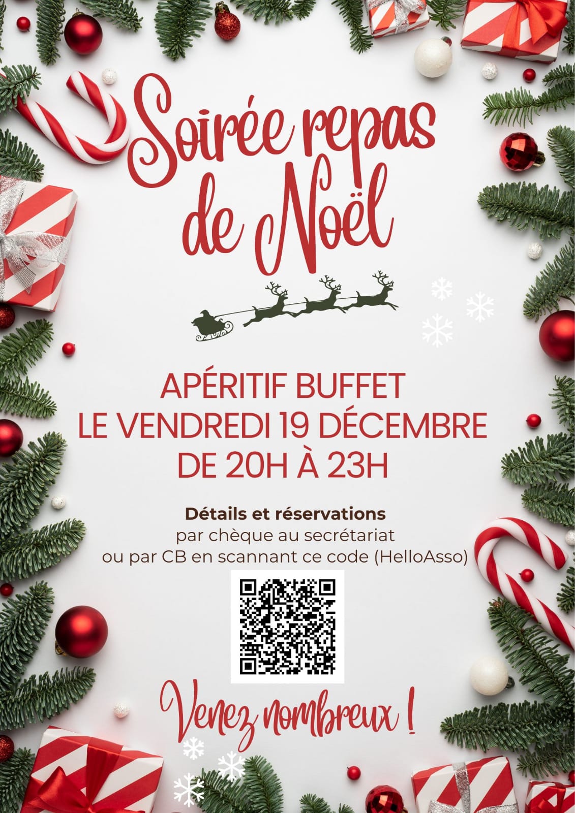 Soirée repas de Noël, vendredi 19 décembre, sous forme de buffet, sympa !! Faîtes passer l’info et, vu les délais, inscriptions au plus vite (lien vers la feuille d’inscription) !!