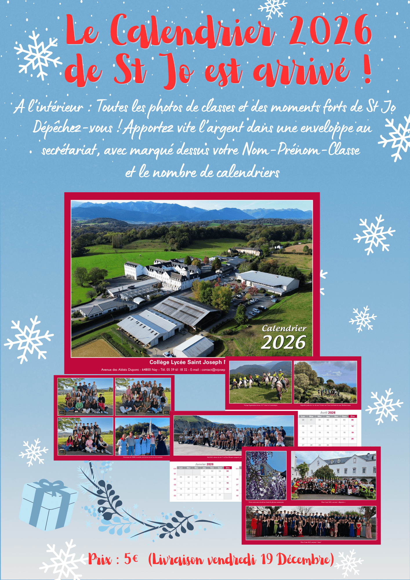 Calendriers 2026, comment ça marche !! On passe dans les classes aujourd’hui pour présenter la nouvelle édition et prendre les commandes. Toute personne est aussi habilitée à passer commande, parents, profs, perso Ogec et amis de St Jo, passez au secrétariat !