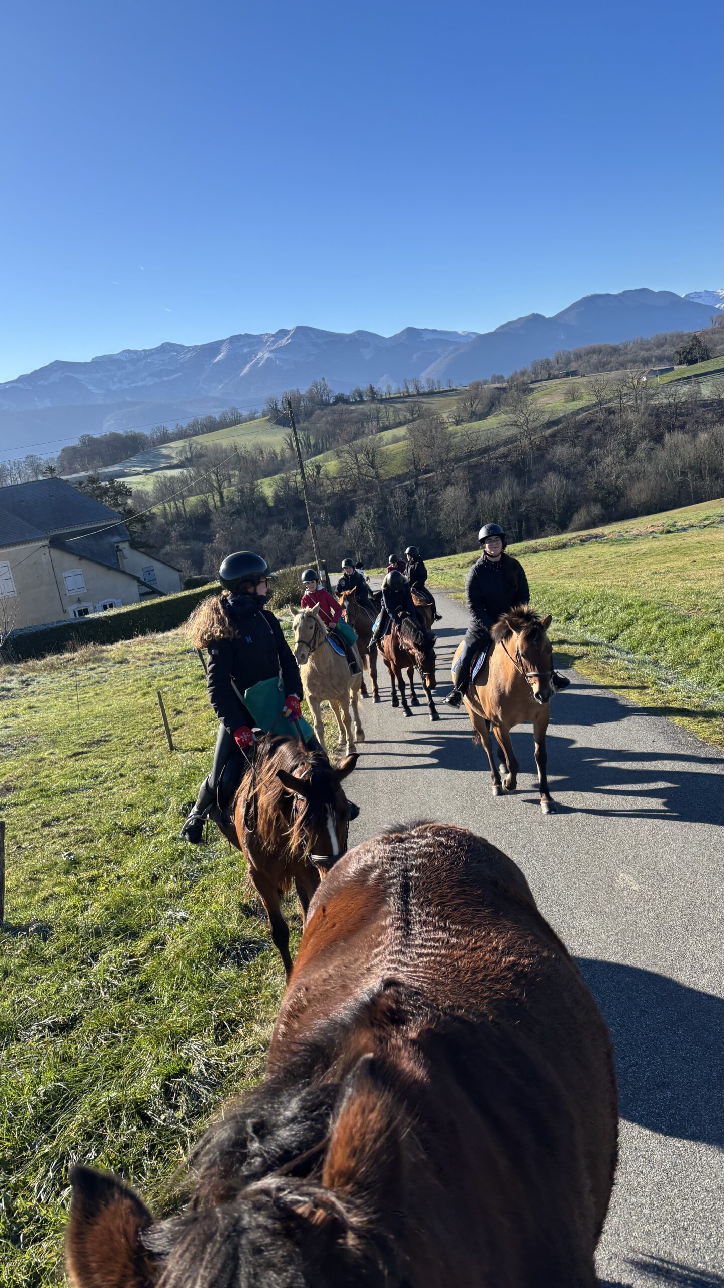 Lundi 5 janvier 2026, 10h49, balade retour depuis Asson pour nos cavaliers de 4°/3°, génial, mais fin des vacances au pré tranquille pour nos chevaux !!