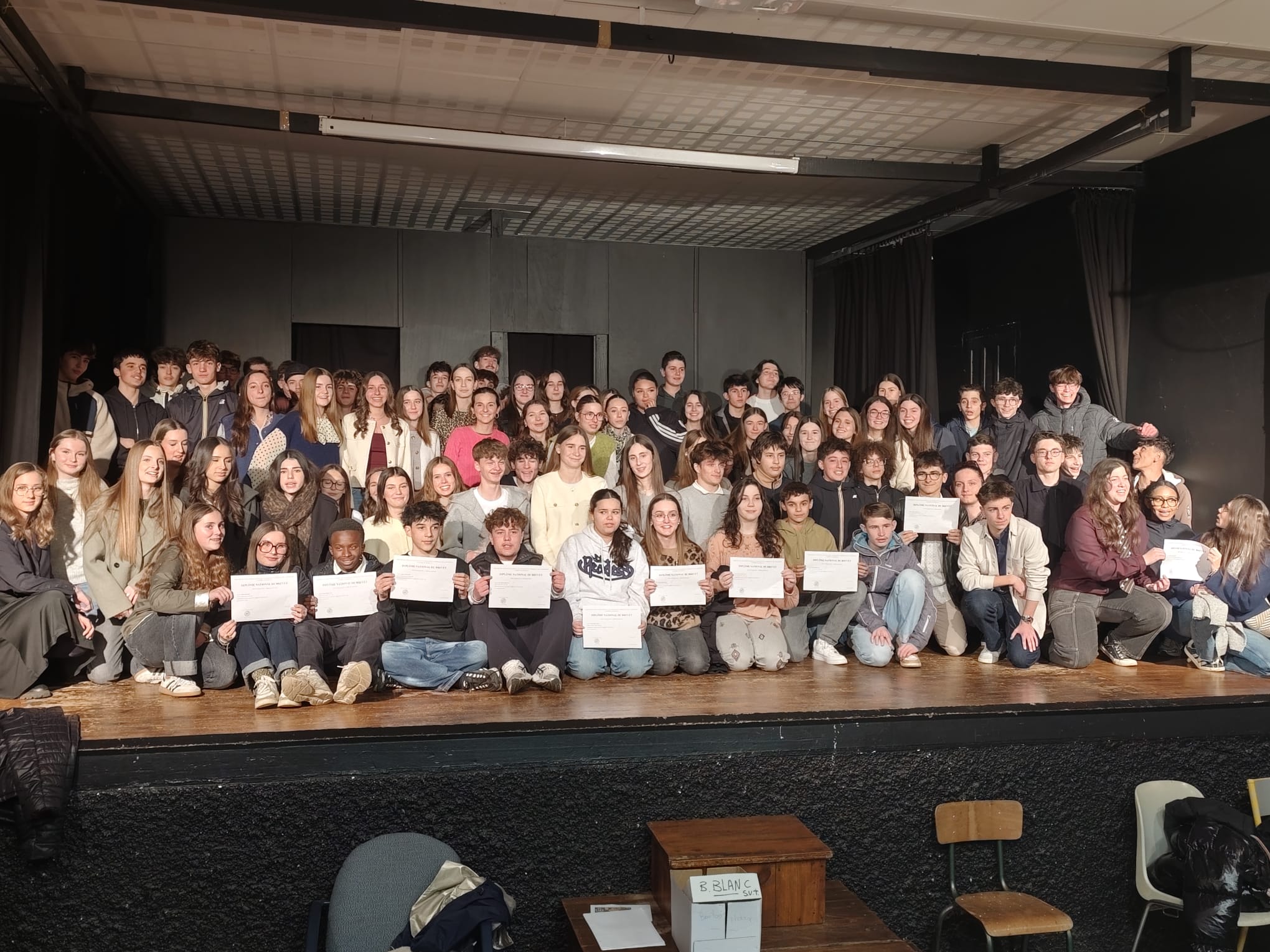 Jeudi 22 janvier 2026, 18h45, remise des diplômes du Brevet 2025, photo de groupe en salle théâtre !