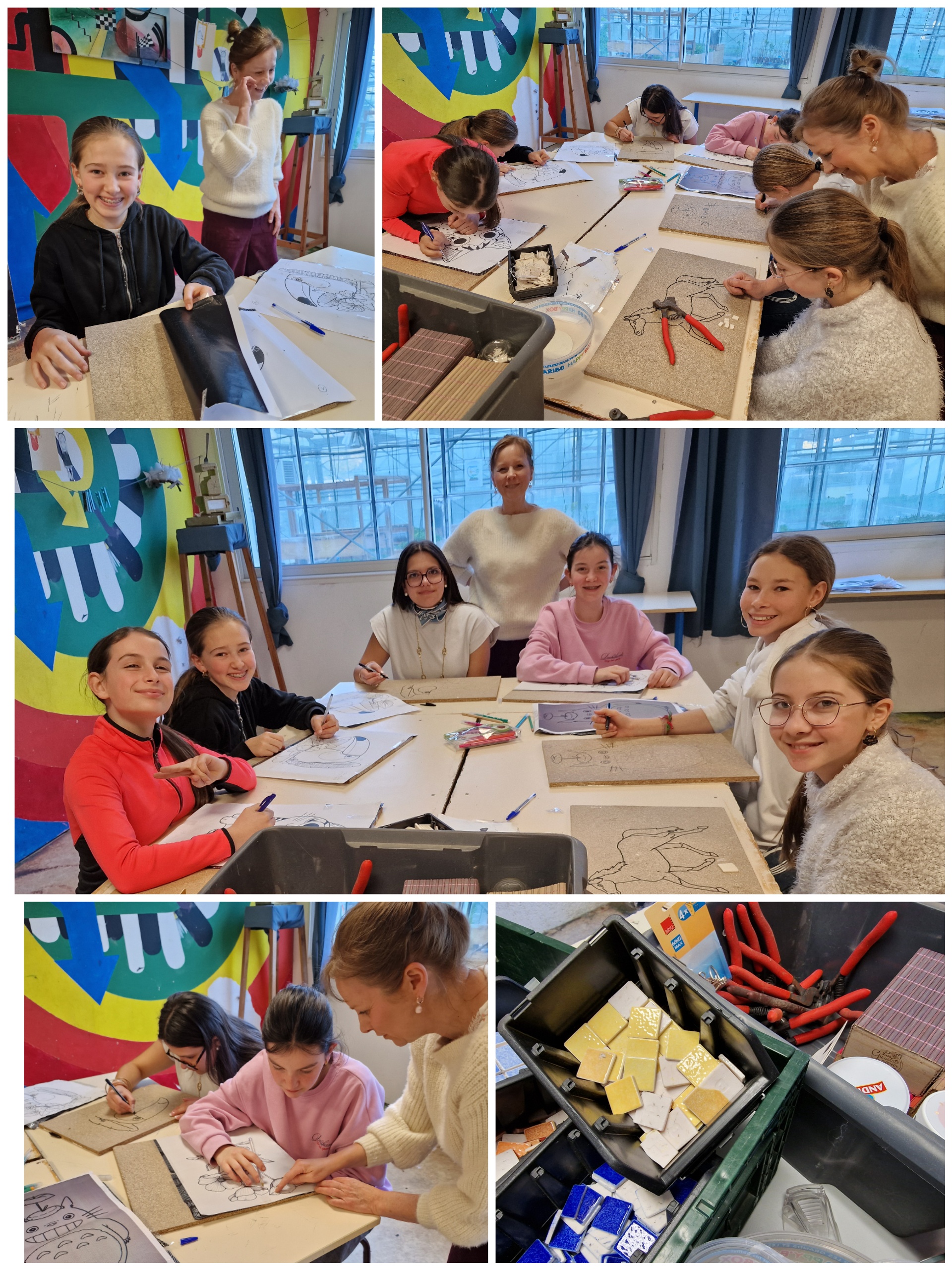 Jeudi 12 mars 2026, de 17h à 18h50 : un retour qui fait plaisir, Claire Robert et son atelier mosaïque réinvestissent les murs de St Jo, et plus précisément la classe d’arts plastiques. Six de nos 5ème internes découvrent et en profitent !!