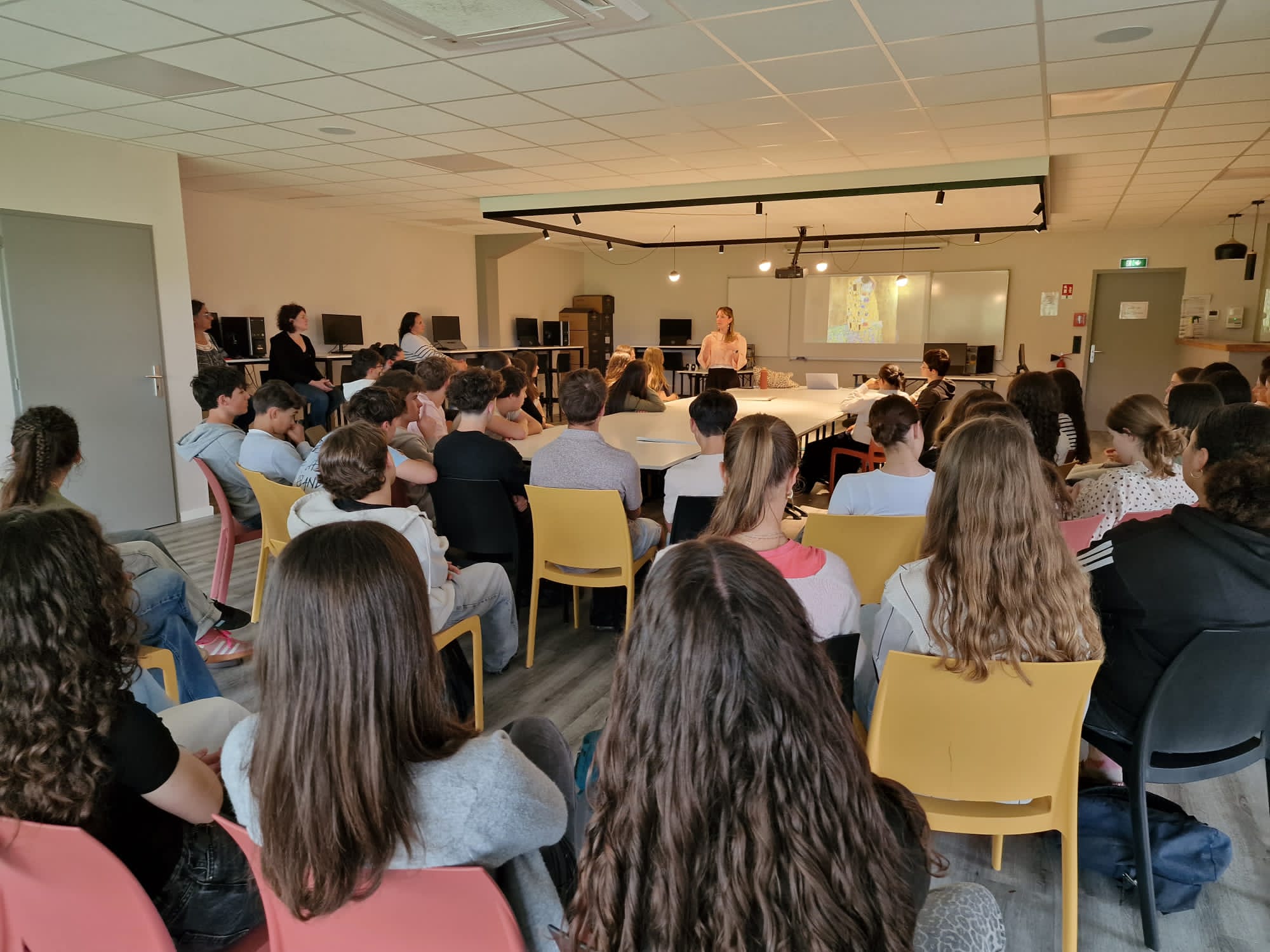 Lundi 27 avril 2026, 16h24, séance EVARS pour une petite moitié de nos 2ndes avec Marion Bussy lors d’un débat sur le thème « Être amoureux ! ».